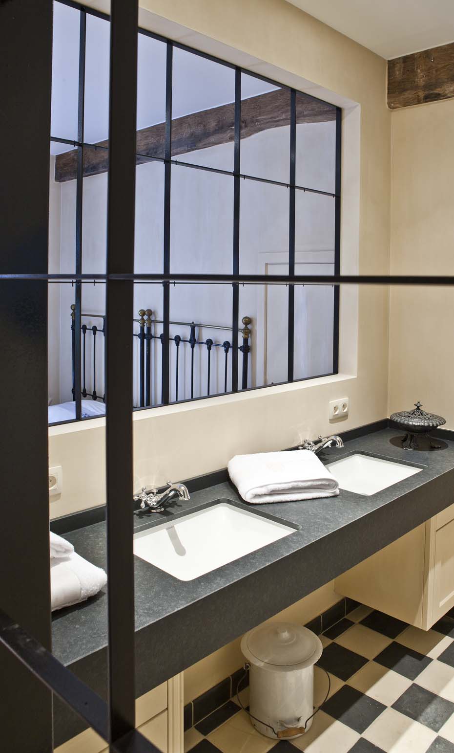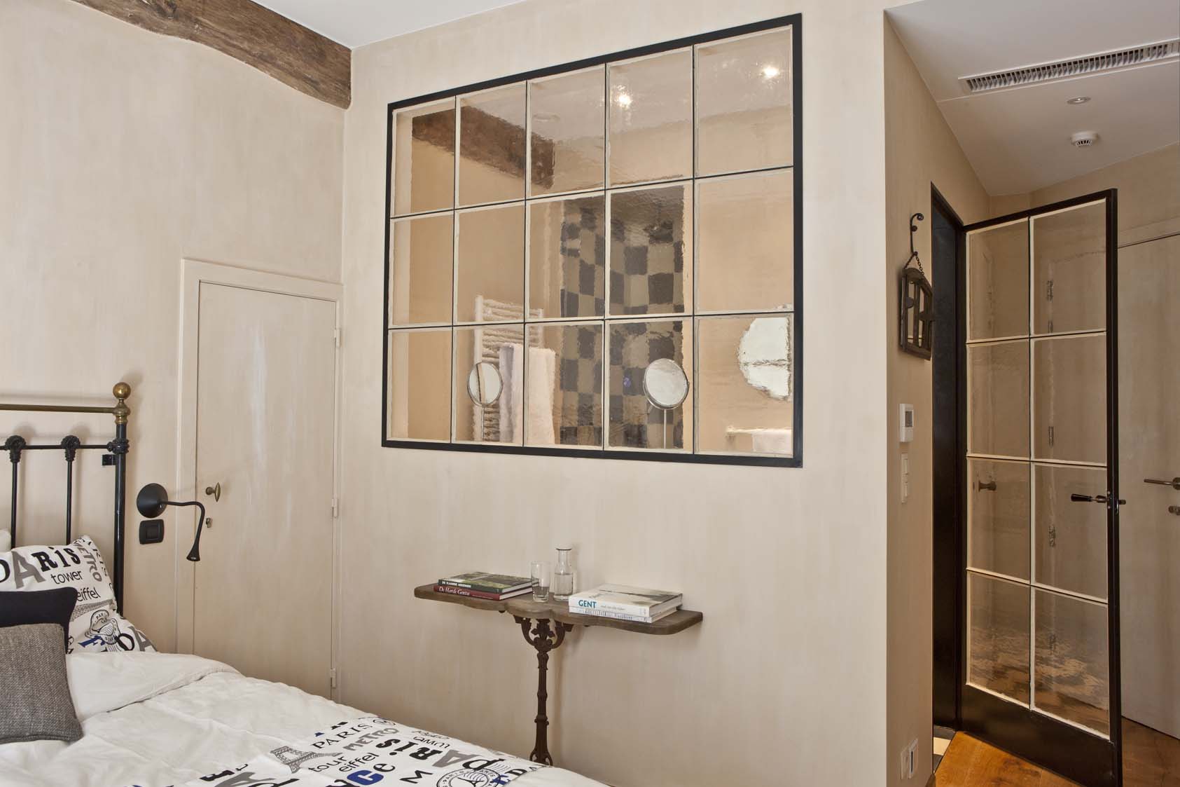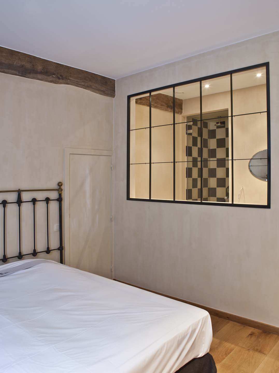 Mais la véritable pièce maîtresse est la fenêtre en fer forgé entre la chambre et la salle de bains, magnifiquement mise en valeur par le verre soufflé à la main.