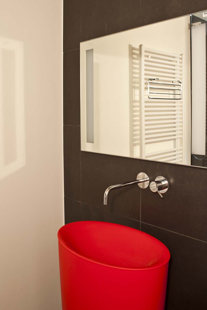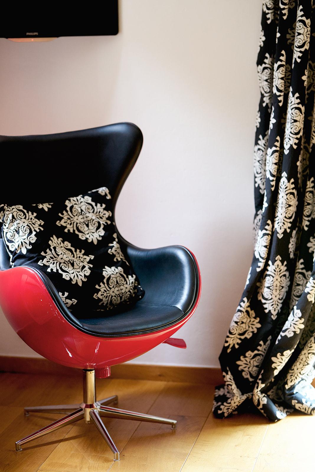 La suite Stendhal tire son nom de l’auteur du célèbre roman « Le Rouge et le Noir ». Elle se compose d’un petit couloir, d’une chambre et d’un coin salon confortable avec une grande fenêtre offrant une vue imprenable sur l’étang et le pigeonnier du parc. Le coin salon est équipé d’un canapé-lit deux places (1,60 m). La chambre présente des touches de rouge et de noir dans un décor moderne et contemporain. La suite est dotée d’une kitchenette (réfrigérateur, micro-ondes, couverts, verres, assiettes, etc.). La salle de bains, également décorée dans les tons rouge et noir, dispose d’une magnifique douche. Le plafond voûté d’origine a été conservé.